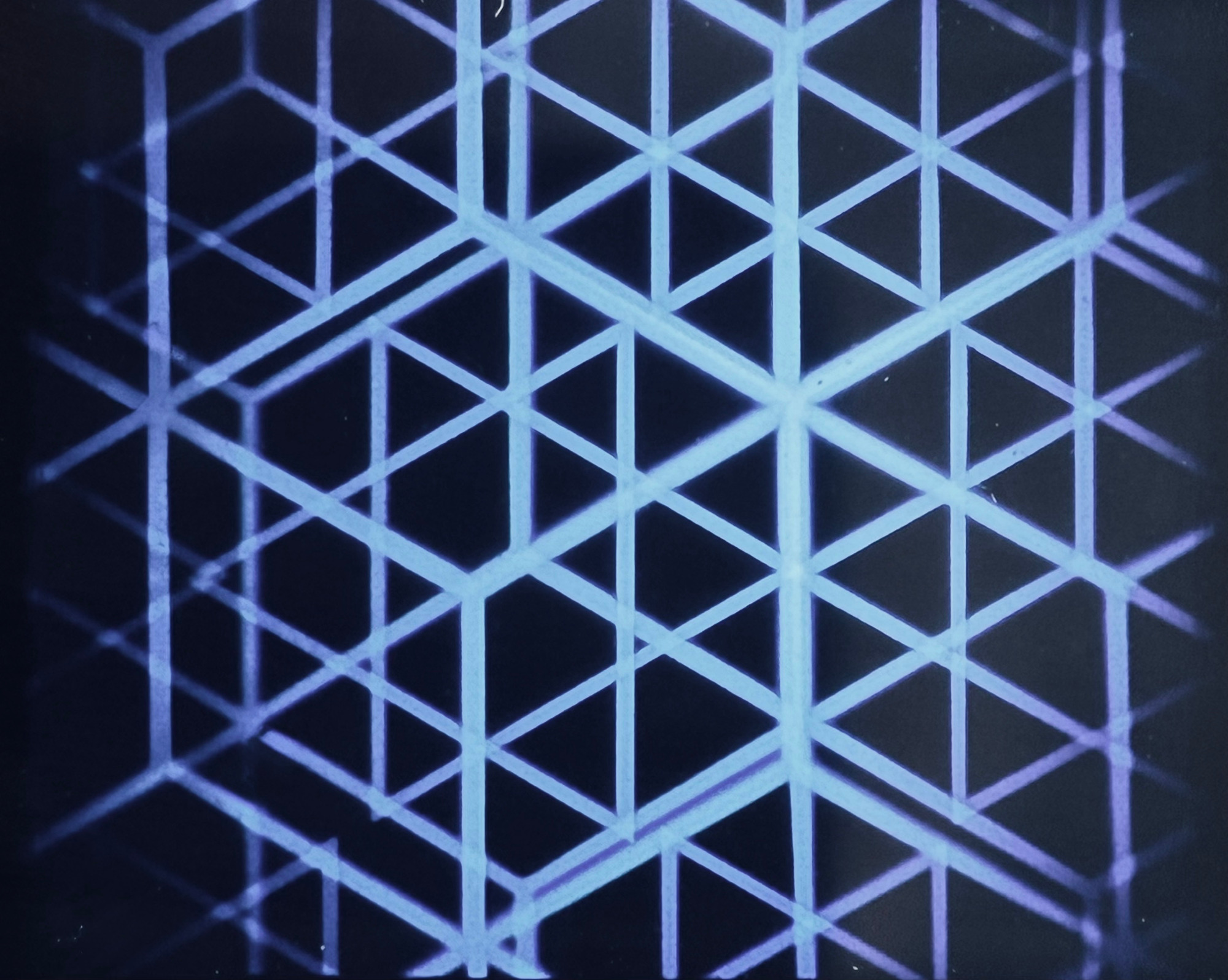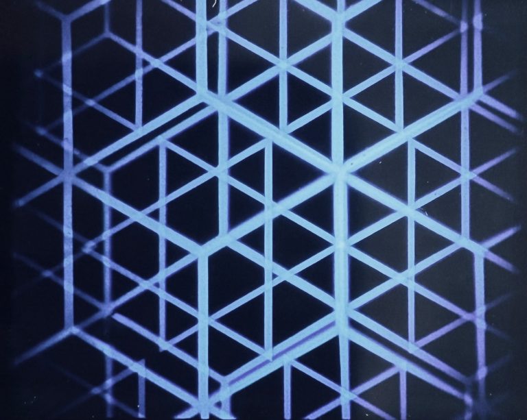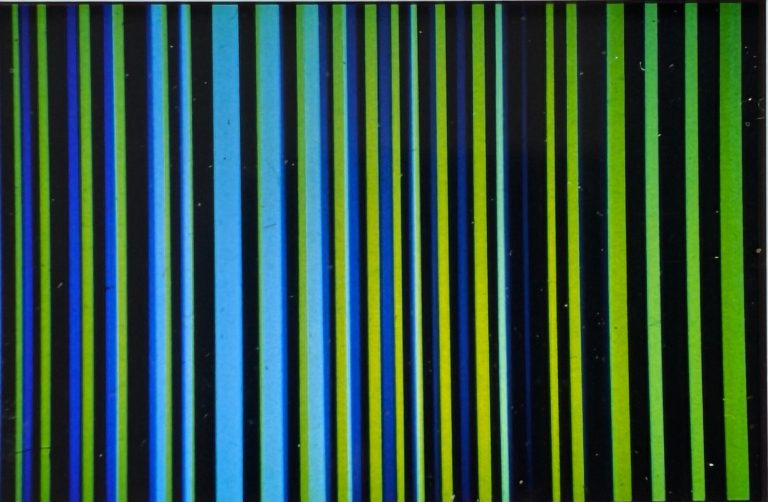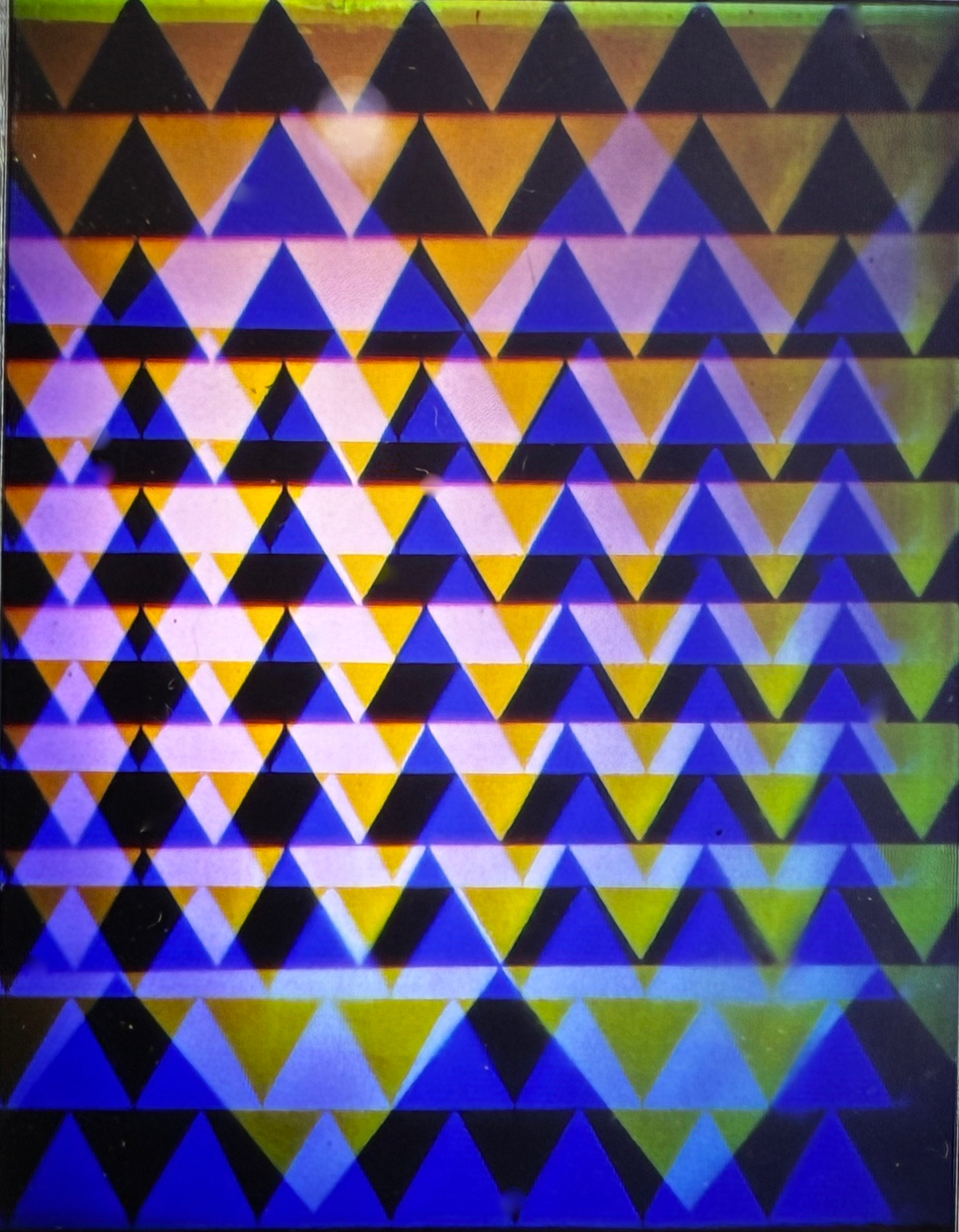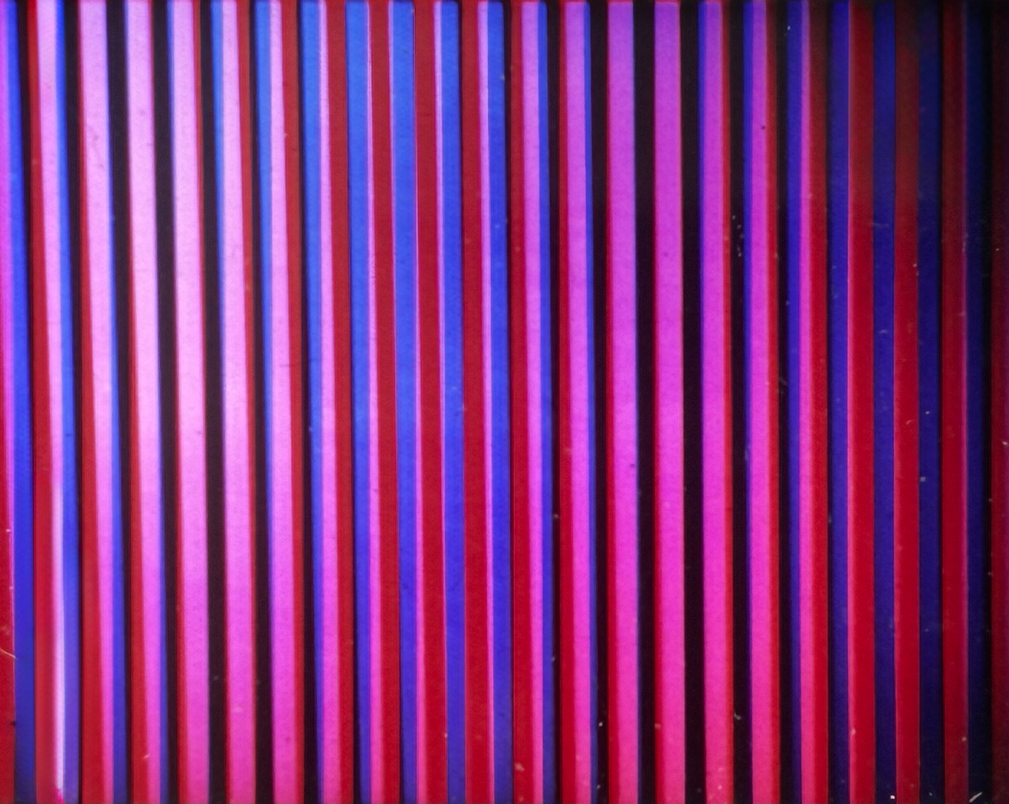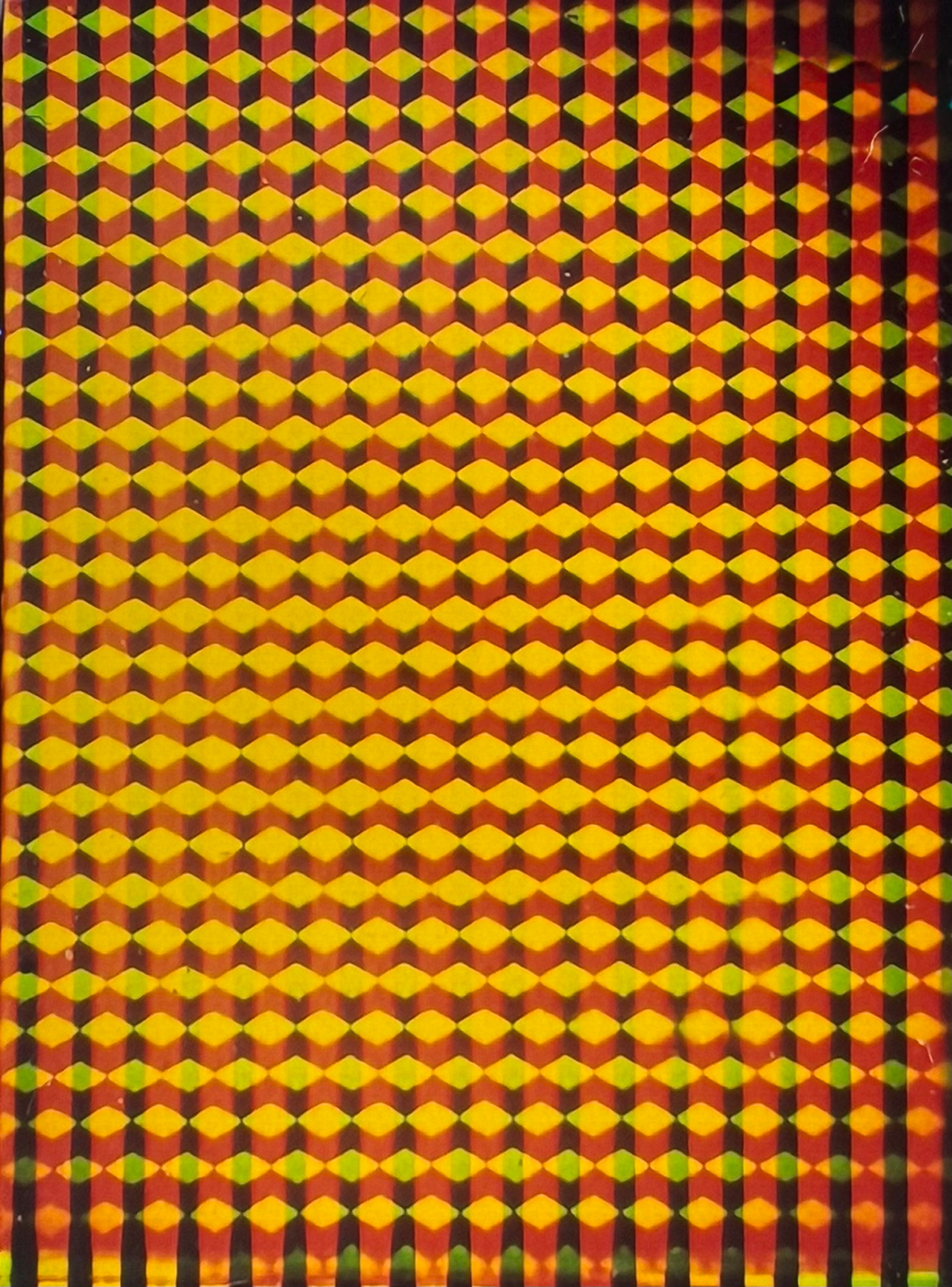 The following abstract holograms were made and produced between 1987-1990. They are known as pseudo colour holograms. This is a technique which is used to create colour images without using multiple laser wavelengths. The colours are created by treating the silver halide emulsion with a bath of chemical solution prior to exposure. The concentration of the bath controls the thickness of the emulsion - this then affects the colour of the hologram when it reconstructs.